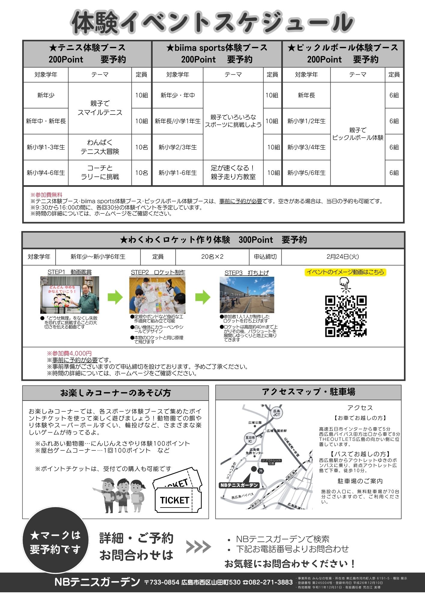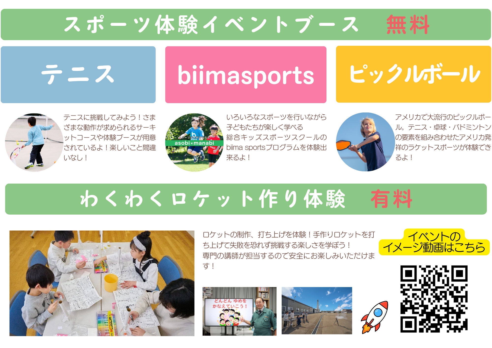 『テニス体験ブース・biima sports体験ブース・ピックルボール体験ブース・わくわくロケット作り体験』は、事前予約が必要です。