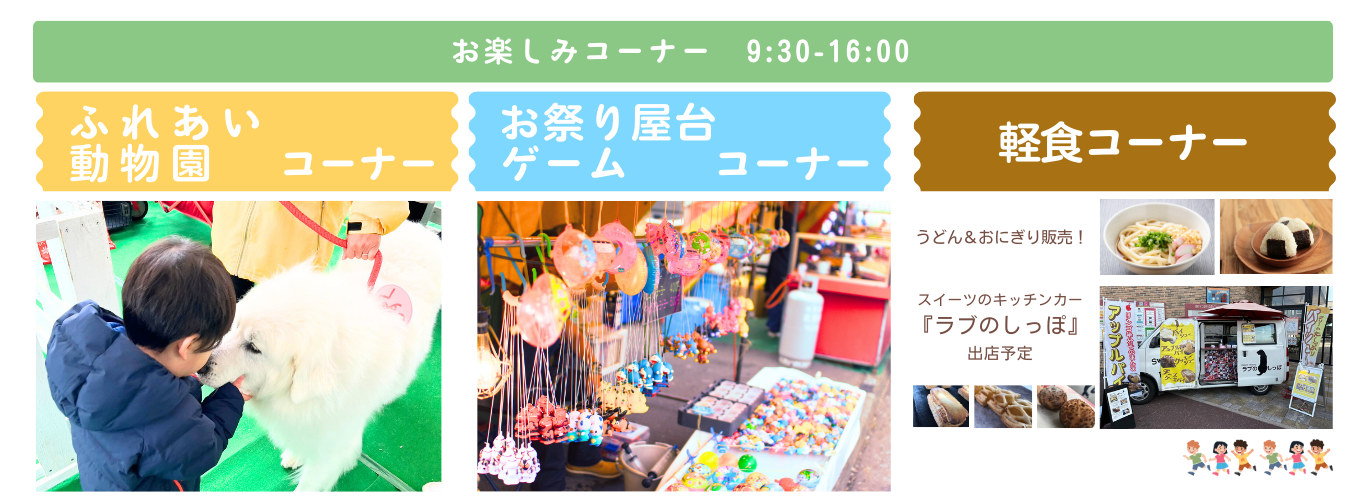 お楽しみコーナーでは、『ふれあい動物園』が開催されます。かわいい動物いっぱい!アルパカ、グレートピレニーズ、コールダックやヒヨコもいます!エサやり体験や記念撮影など楽しいイベント満載です!!さらにお祭り屋台コーナーでスーパーボールすくいや輪投げなど、家族みんなで楽しめるアクティビティが盛りだくさんです。楽しい思い出を一緒につくりましょう。軽食コーナーもあるよ!